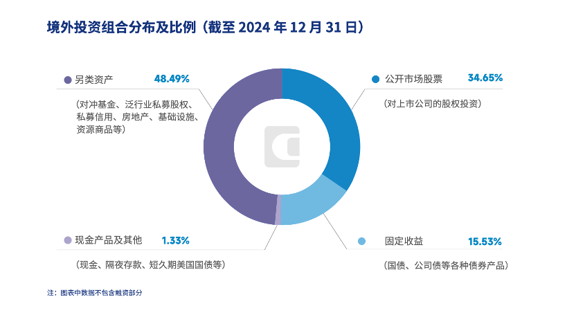 年报显示,截至 2024 年底,另类资产在境外投资组合中的占比最高,达到48.49%,占据总投资组合的近半壁江山。这类资产包括对冲基金、泛行业私募股权、私募信用、房地产、基础设施及资源商品等。