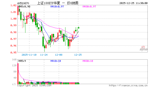12月25日,截止午间收盘,上证180ETF华夏(510670)涨0.20%,报0.985元,成交额686.81万元。上证180ETF华夏(510670)重仓股方面,贵州茅台截止午盘涨0.53%,紫金矿业跌1.02%,恒瑞医药跌0.16%,中国平安涨2.55%,药明康德跌0.15%,寒武纪跌0.74%,工业富联涨2.78%,招商银行涨0.05%,中芯国际跌0.30%,海光信息涨0.91%。