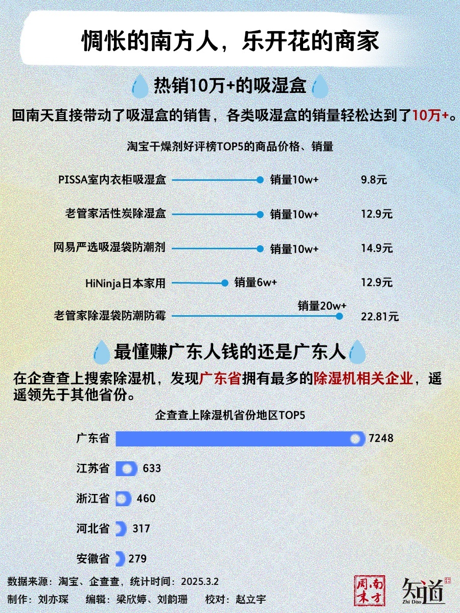 回南天也直接带动了吸湿盒的销售,各类吸湿盒的销量轻松达到了10万+。除湿机在此时也开始热卖,广东省以7248家除湿机相关企业遥遥领先其他省份,最懂赚广东人钱的果然还是广东人。
